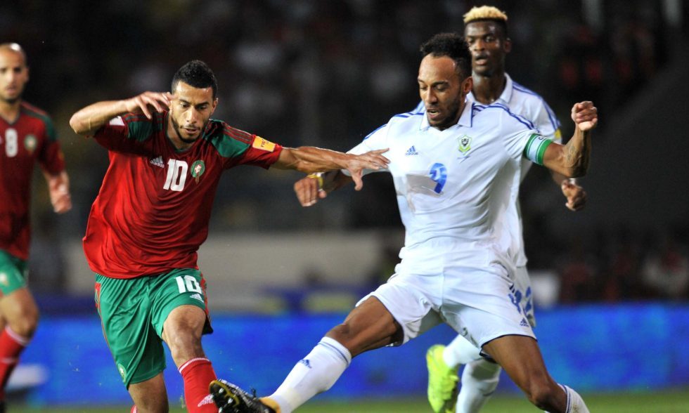 Younes Belhanda of Morocco is challenged by Pierre-Emerick Aubameyang of of Gabon during the 2018 World Cup qualifying game between Morocco and Gabon at the Complexe Mohammed V Stadium in Casablanca, Morocco on 7 October 2017 © Gerard Trilles/BackpagePix